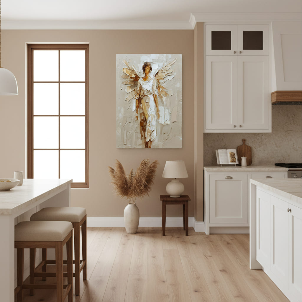 Dnevni boravak: Velika slika s anđelom može biti dominantan element iznad sofe ili kamina. Zlatni detalji i meke boje privući će pažnju i dodati luksuz prostoru.